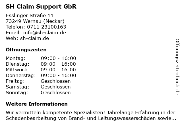 | Öffnungszeiten SH Claim Support GbR in Wernau (Neckar) anzeigen | |