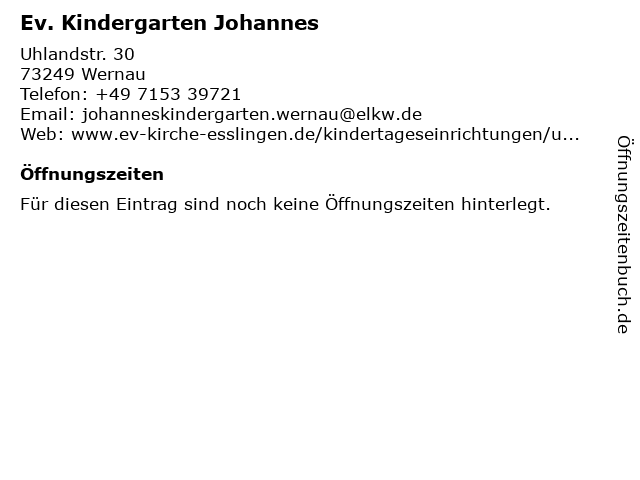 | Öffnungszeiten Ev. Kindergarten Johannes in Wernau anzeigen | |