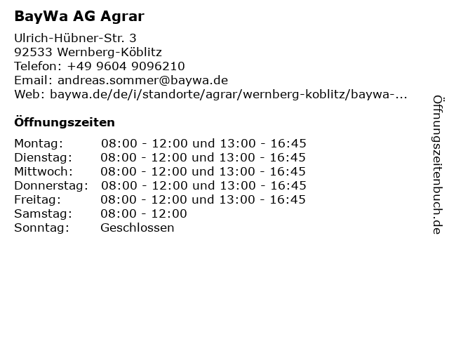 | Öffnungszeiten BayWa AG Agrar in Wernberg-Köblitz anzeigen | |