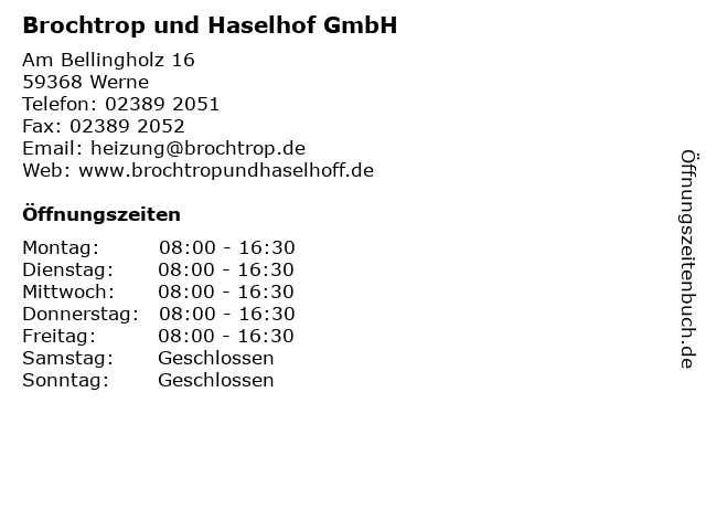 | Öffnungszeiten Brochtrop und Haselhof GmbH in Werne anzeigen | |
