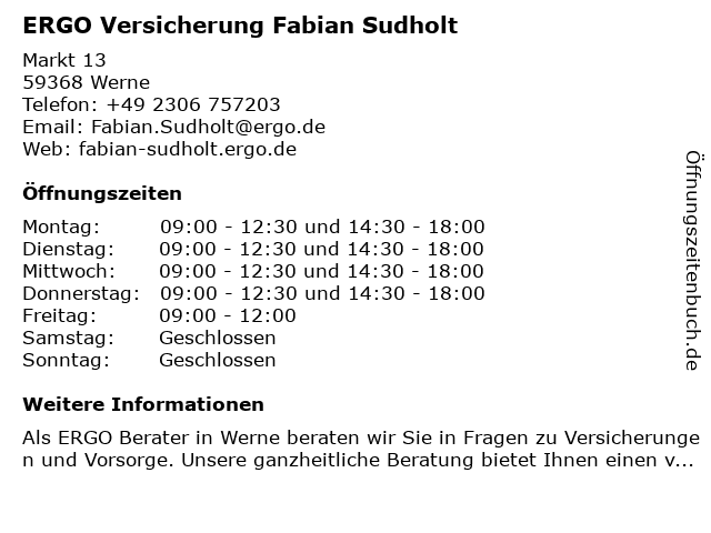 1 Bernhard Helling ERGO Versicherungsgruppe AG Geschäftsstelle (Entfernung: 0,11 km) Kirchhof 7, 59368 Werne 5 Fabian Skalski Garten- und Landschaftsbau (Entfernung: 11,32 km) Fritz-husemann-straße 13, 59199 Bönen 6 Hammer Schlüsseldienst Schröter + Fabian Haus für Sicherheit GmbH - Bürozeiten (Entfernung: 11,39 km) Otto-Brenner-Straße 8, 59067 Hamm |