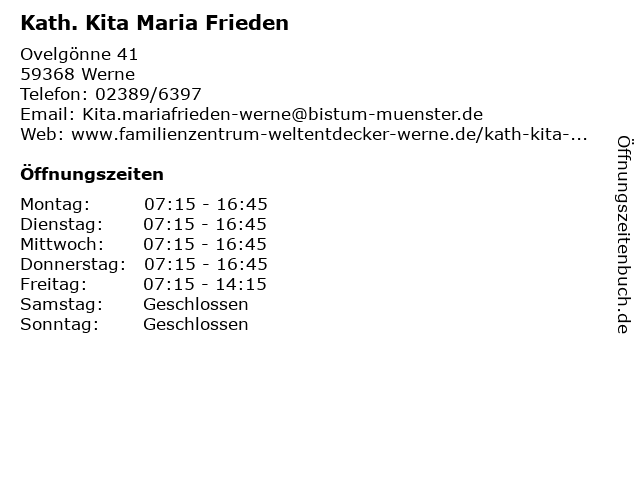 | Öffnungszeiten Kath. Kita Maria Frieden in Werne anzeigen | |