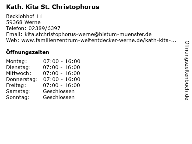 | Öffnungszeiten Kath. Kita St. Christophorus in Werne anzeigen | |