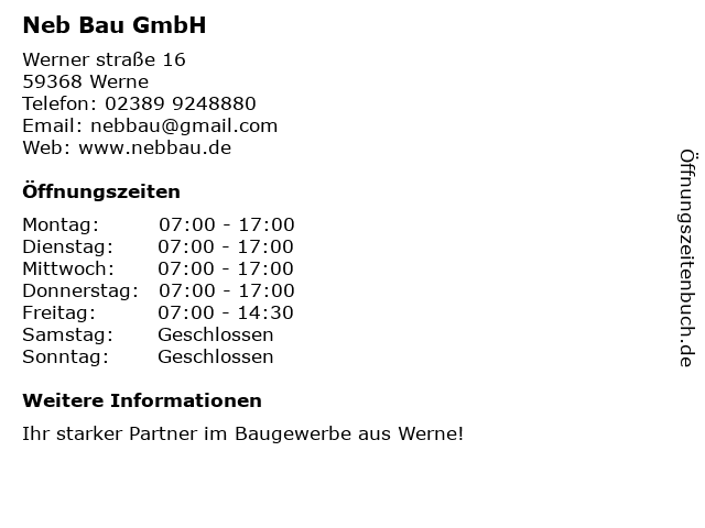 | Öffnungszeiten Neb Bau GmbH in Werne anzeigen | |