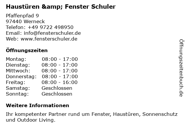 | Öffnungszeiten Haustüren & Fenster Schuler in Werneck anzeigen | |