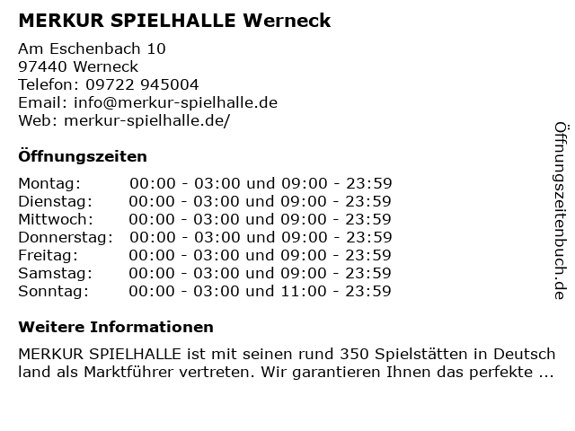 | Öffnungszeiten MERKUR SPIELHALLE Werneck in Werneck anzeigen | |