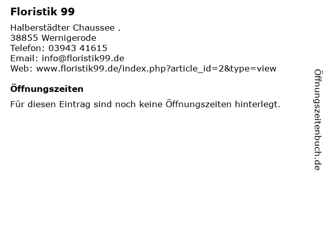 | Öffnungszeiten Floristik 99 in Wernigerode anzeigen | |