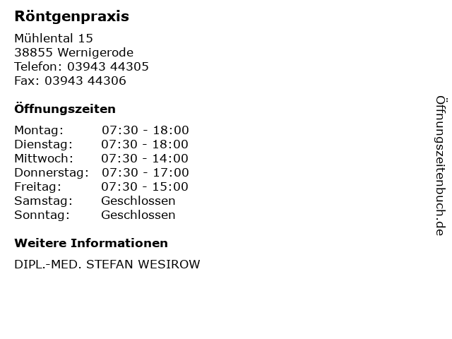 | Öffnungszeiten Röntgenpraxis in Wernigerode anzeigen | |
