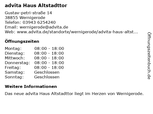 | Öffnungszeiten advita Haus Altstadttor in Wernigerode anzeigen | |