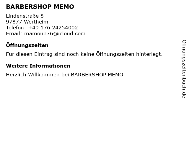 | Öffnungszeiten BARBERSHOP MEMO in Wertheim anzeigen | |