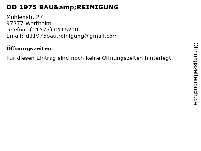| Öffnungszeiten DD 1975 BAU&REINIGUNG in Wertheim anzeigen | |