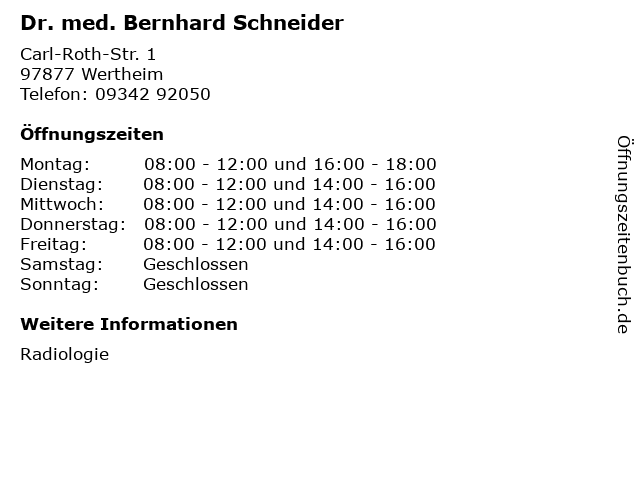 | Öffnungszeiten Dr. med. Bernhard Schneider in Wertheim anzeigen | |