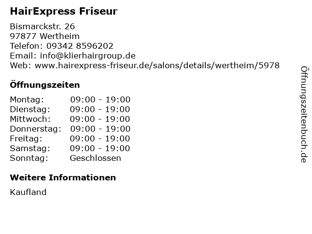 | Öffnungszeiten HairExpress Friseur in Wertheim anzeigen | |
