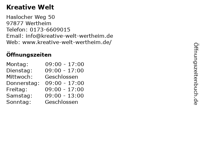 | Öffnungszeiten Kreative Welt in Wertheim anzeigen | |