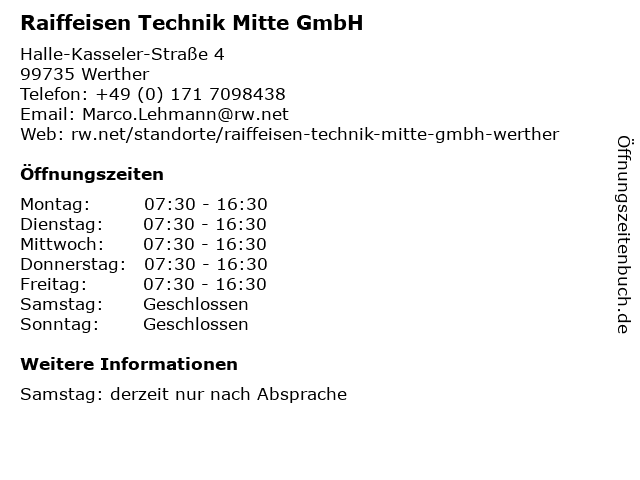 5 Raiffeisen Waren GmbH - Technik-Center Wipperdorf (Entfernung: 6,90 km) Halle-Kasseler-Str. 11, 99752 Wipperdorf 6 |