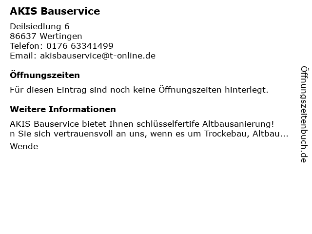 | Öffnungszeiten AKIS Bauservice in Wertingen anzeigen | |
