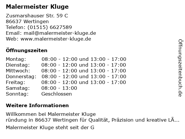 | Öffnungszeiten Malermeister Kluge in Wertingen anzeigen | |
