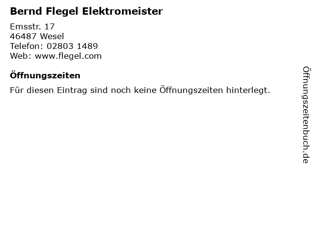 | Öffnungszeiten Bernd Flegel Elektromeister in Wesel anzeigen | |