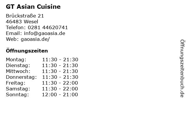 | Öffnungszeiten GT Asian Cuisine in Wesel anzeigen | |