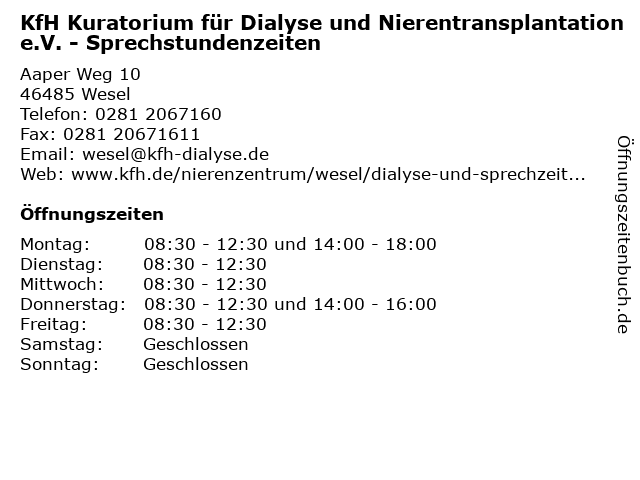 1 KfH Kuratorium für Dialyse und Nierentransplantation e.V. - Dialysezeiten (Entfernung: 0,01 km) Aaper Weg 10, 46485 Wesel 2 Nephrologische Schwerpunktpraxis und Dialyse Walsum (Entfernung: 16,52 km) Willy-Bartock-Str. 101, 47179 Duisburg 4 KfH-Gesundheitszentrum - Zweigpraxis Rheinbabenstr. (Entfernung: 36,01 km) Rheinbabenstr. 168, 47809 Krefeld 5 KfH-Gesundheitszentrum - Dr. med. Heribert Schöndeling (Entfernung: 38,13 km) Lutherplatz 56, 47805 Krefeld 6 |
