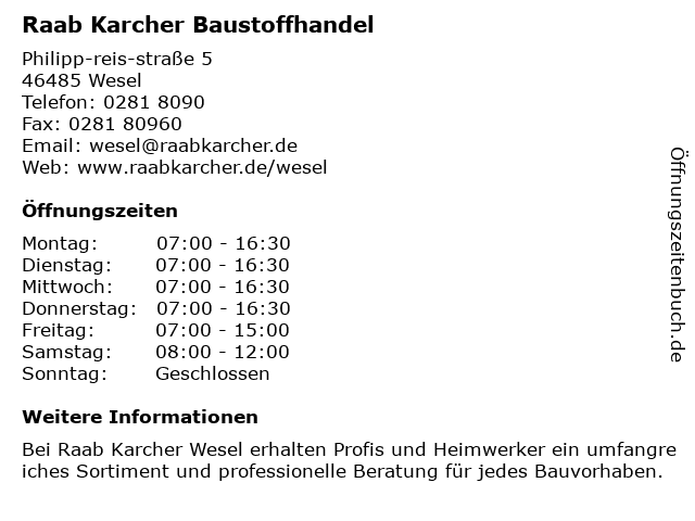 | Öffnungszeiten Raab Karcher Baustoffhandel in Wesel anzeigen | |