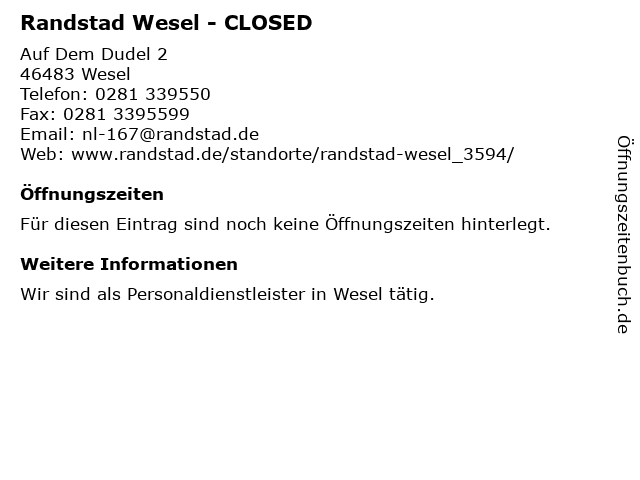 | Öffnungszeiten Randstad Wesel - CLOSED in Wesel anzeigen | |