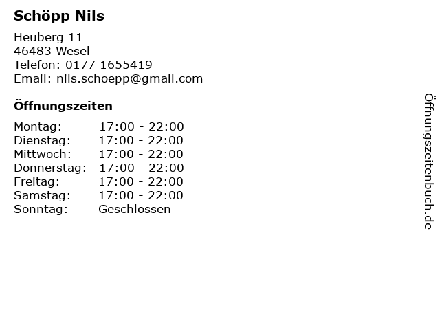 | Öffnungszeiten Schöpp Nils in Wesel anzeigen | |
