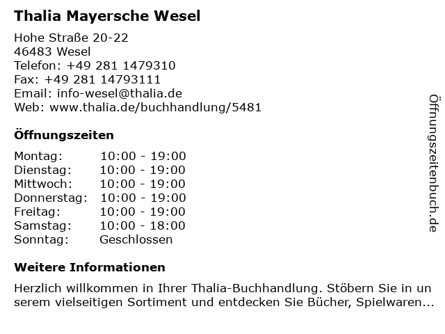 | Öffnungszeiten Thalia Mayersche Wesel in Wesel anzeigen | |