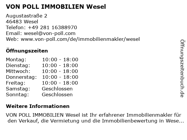 | Öffnungszeiten VON POLL IMMOBILIEN Wesel in Wesel anzeigen | |