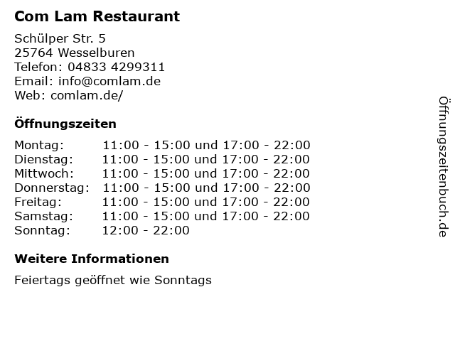 | Öffnungszeiten Com Lam Restaurant in Wesselburen anzeigen | |