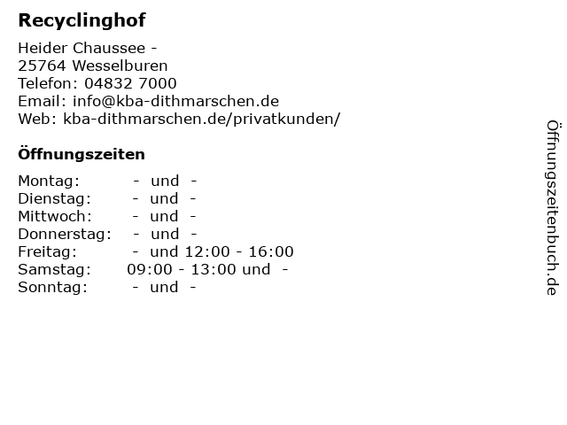 | Öffnungszeiten Recyclinghof in Wesselburen anzeigen | |