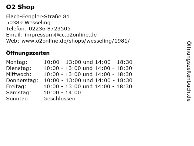 | Öffnungszeiten O2 Shop in Wesseling anzeigen | |