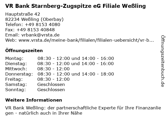 2 VR Bank Starnberg-Herrsching-Landsberg eG - (Geldautomat Weßling) (Entfernung: 0,03 km) Hauptstraße 42, 82234 Weßling 4 VR Bank Starnberg-Herrsching-Landsberg eG - (Geldautomat Gilching) (Entfernung: 4,07 km) Sonnenstraße 53, 82205 Gilching 5 VR Bank Starnberg-Herrsching-Landsberg eG - (Geldautomat Inning) (Entfernung: 7,14 km) Marktplatz 14, 82266 Inning 6 VR Bank Starnberg-Zugspitze eG Filiale Inning (Entfernung: 7,15 km) Marktplatz 14, 82266 Inning (Ammersee) |