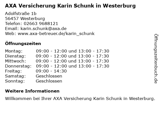 3 AXA Hauptvertretung Antony Kisters (Entfernung: 6,44 km) Pottumer Str. 4, 56479 Hellenhahn-Schellenberg 6 AXA Regionalvertretung Meuser & Krauß OHG (Entfernung: 13,01 km) Hauptstraße 69, 35794 Mengerskirchen |