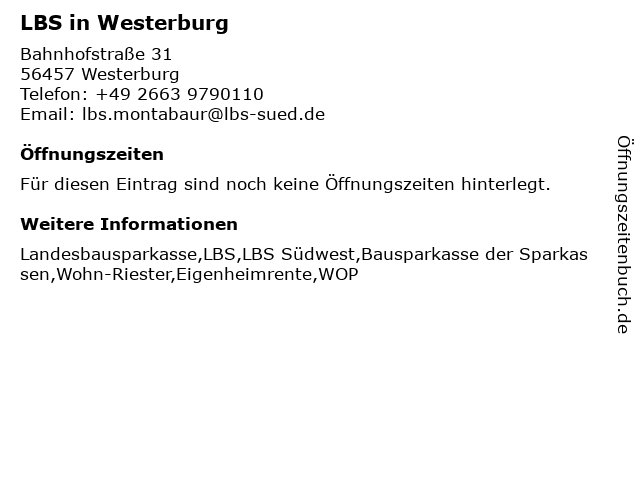 | Öffnungszeiten LBS in Westerburg in Westerburg anzeigen | |