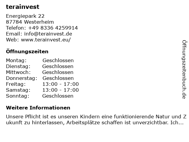 | Öffnungszeiten terainvest in Westerheim anzeigen | |