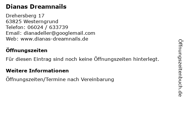 | Öffnungszeiten Dianas Dreamnails in Westerngrund anzeigen | |