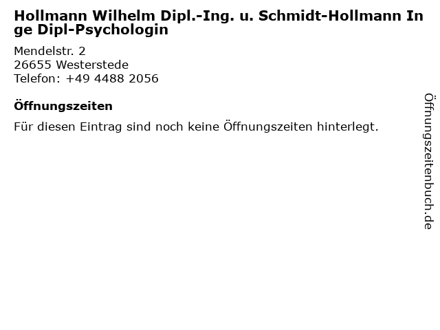 | Hollmann Wilhelm Dipl.-Ing. u. Schmidt-Hollmann Inge Dipl-Psychologin anrufen | |