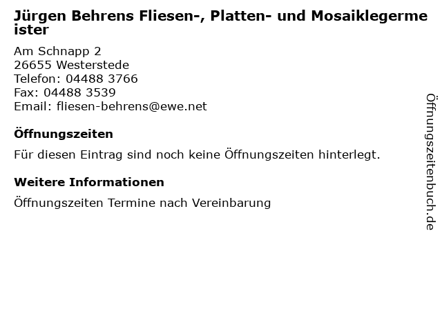 | Jürgen Behrens Fliesen-, Platten- und Mosaiklegermeister anrufen | |