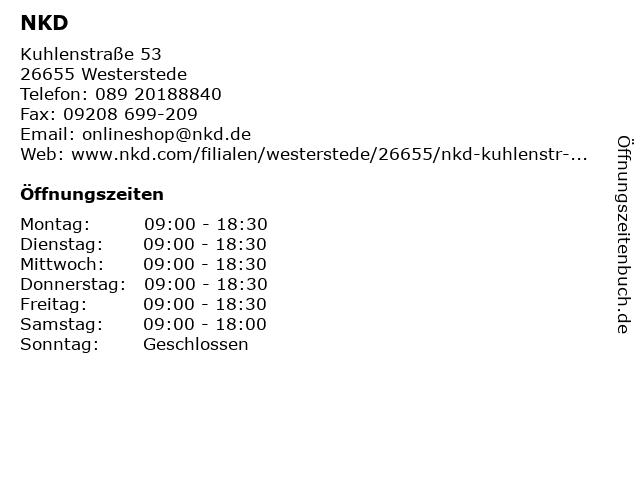 | Öffnungszeiten NKD in Westerstede anzeigen | |