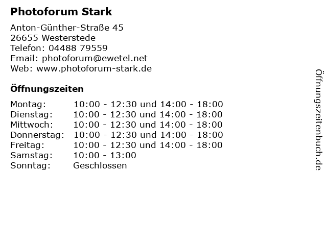 | Öffnungszeiten Photoforum Stark in Westerstede anzeigen | |