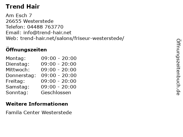 | Öffnungszeiten Trend Hair in Westerstede anzeigen | |