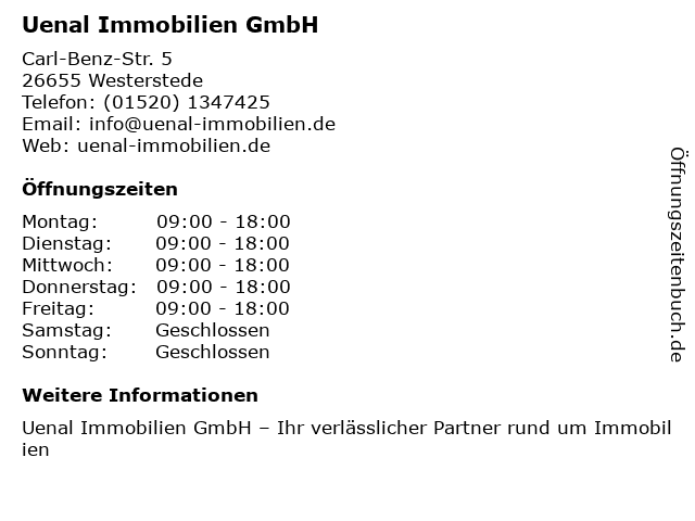 | Öffnungszeiten Uenal Immobilien GmbH in Westerstede anzeigen | |