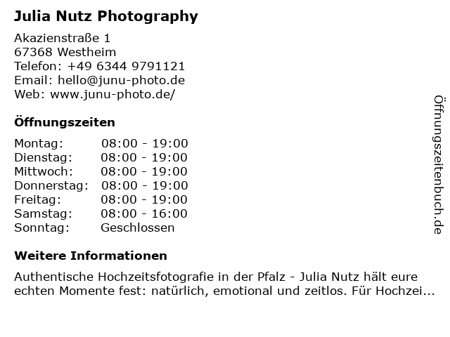 | Öffnungszeiten Julia Nutz Photography in Westheim anzeigen | |