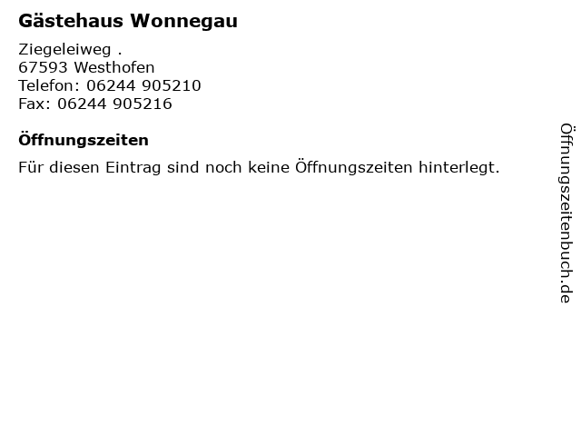 | Öffnungszeiten Gästehaus Wonnegau in Westhofen anzeigen | |