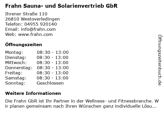Branchen & Suchbegriffe zu Frahn Sauna- und Solarienvertrieb GbR:frahn, gbr, sauna, solarienvertrieb |