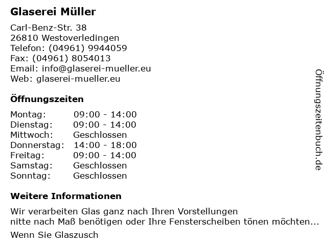 | Öffnungszeiten Glaserei Müller in Westoverledingen anzeigen | |