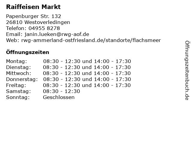 | Öffnungszeiten Raiffeisen Markt in Westoverledingen anzeigen | |