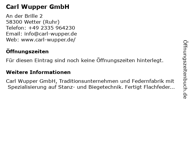 | Öffnungszeiten Carl Wupper GmbH in Wetter (Ruhr) anzeigen | |