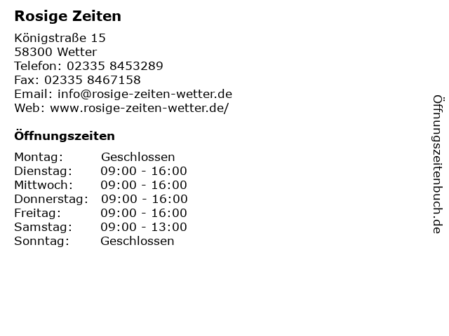 | Öffnungszeiten Rosige Zeiten in Wetter anzeigen | |